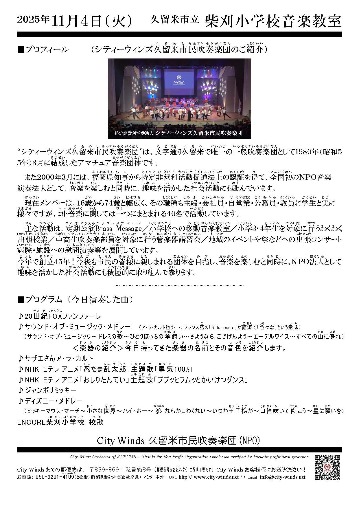 City Winds 久留米市民吹奏楽団(NPO)は、地域社会への音楽を通した貢献活動の一環として、2025年11月4日(火)に